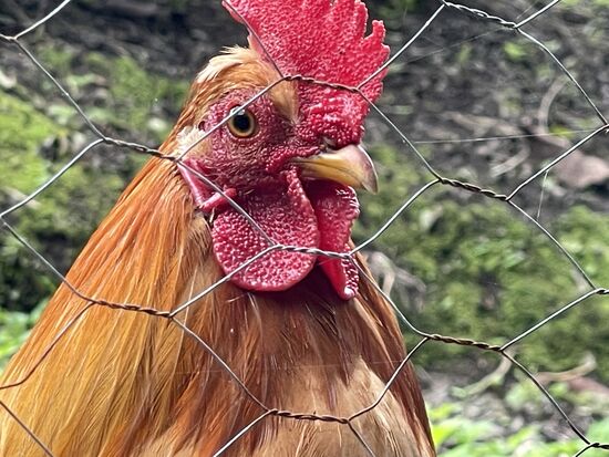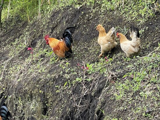 Auch ein paar Hühner laufen uns über den Weg. Auch sie werden vor allem für den Eigenbedarf gehalten und liefern immer frische Eier. Vorbei an Brombeeren, die allerdings im Moment von den Hühnern zerfetzt sind und von denen normalerweise Konfitüre oder Fruchtsäfte gemacht werden, kommen wir zu einer kleinen Pflanzung mit verschiedenen Kaffeesorten.