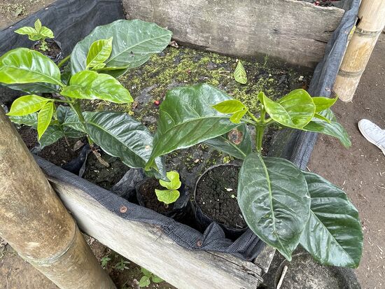 Natalie hat ein paar rote Kirschen gefunden und gibt sie uns. Wir sollen sie schälen und die beiden Kaffeebohnen in den sandigen Boden stecken. Die Samen werden jetzt gut zwei Monate brauchen, bis aus ihnen kleine Pflanzen entstehen. Bereits hier werden sie dann aussortiert. Er wird kontrolliert, ob die Blätter in Ordnung sind und die Wurzeln sich richtig entwickeln. Danach werden sie einzeln in Plastiksäcke gesteckt und noch etwas weiter gepflegt, bevor sie an ihren endgültigen Standort kommen. Das Aussäen und Pickieren macht man auf dieser Farm allerdings nicht selber, man kauft direkt die kleinen Pflanzen, denn schon die Aufzucht ist sehr aufwändig.