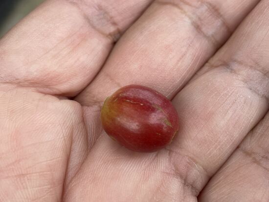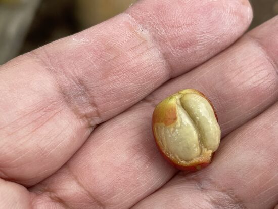 Arabica braucht viel Pflege und vor allem keine ständige Sonnenbestrahlung. Darum wachsen hier überall auf der Pflanzung höhere Bäume oder Bananenstauden. Sie geben den Pflanzen den nötigen Schatten. Bei der Frucht spricht man von Kaffeekirschen oder Trauben. Im Moment sind nur vereinzelte Früchte reif, noch sind sie grün. Auch Blüten gibt es keine, nur eine einzelne finden wir, als wir eine der grünen Pflanzen untersuchen.