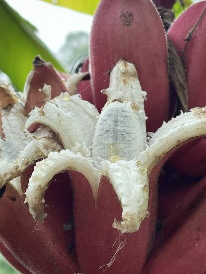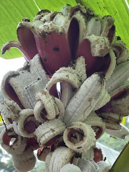 Interessanter finde ih die kleinen roten Bananen. Laut Wikipedia heissen sie Keniabananen und mir sind sie schon im botanischen Garten aufgefallen. Es erstaut mich, dass Natalie sie als ungeniessbar bezeichnet. Sie werden denn auch nicht geerntet, sondern platzen irgendwann am Stamm, was zu skurilen Formen führt. Wahrscheinlich werden sie so zu Vogelfutter.