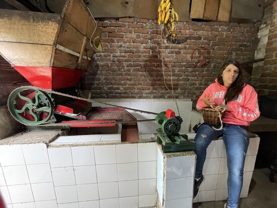 Wir sollen jetzt die Ernte weiter bearbeiten. Alex dreht die Kurbel der Schälmaschine und teilt dadurch die Schalen und die Bohnen. In der grossen Produktion macht dies eine grosse Maschine. Die Bohnen fallen dann in einen Bottich, wo sie ein paar Tage liegen bleiben und fermentieren. Nach der Fermentierung werden sie getrocknet. Dazu legt man sie in die Sonne. Das kann ein bis zwei Wochen dauern. Leider sieht es im Moment nach Regen aus, darum sind die grossen Trockenschubladen eingefahren. Während des Trocknungsprozesses, werden die Bohnen immer wieder durchmischt.