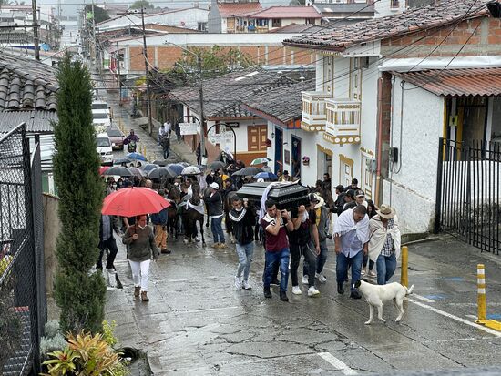 Mit dem Willy geht es zurück nach Salento. Als ich in die Strasse zum Hotel einbiege sehe ich weit unten eine Ansammlung Leute, die die Strasse herauf kommen. Eine Demonstration? Menschen stehen an der Strasse und beobachten den Zug und als sie näher kommen, kann ich einen Sarg erkennen.