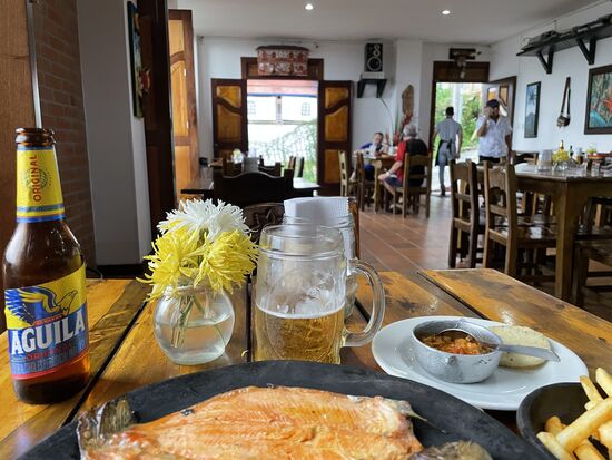 Ich bestelle heute noch einmal eine Forelle zum Nachtessen. Frage aber diesmal vorher wie sie serviert wird und bin sehr zufrieden mit dem feinen geräuchten Fisch mit Pommes. Dazu gibt es die orangen Mandarinen-Limonen, die mir schon auf der Farm aufgefallen sind. Sie sind sauer, haben aber viel mehr Saft als die normalen Zitronen und sind aromatischer.