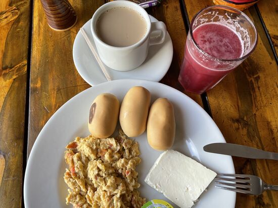 Gestern hat er dann doch frei bekommen und ist für zwei Tage nach Medellin gefahren. Ich sehe seine Fotos heute Morgen im Facebook. Dafür ist sein Bruder Cristian und Manuel, ein junger Kellner noch hier. Als ich meine Rechnung begleiche, meint Cristian: "Das ist für mich ein ganzer Monatslohn". Ja, da hat er wohl Recht. Der Minimallohn in Kolubien beträgt 1'200'000 Pesos, das sind gerade mal 300 Franken. Nach Abzug aller Sozialkosten bleibt das, was ich heute Morgen für meine neun Tage bezahlt habe.