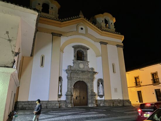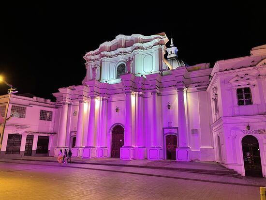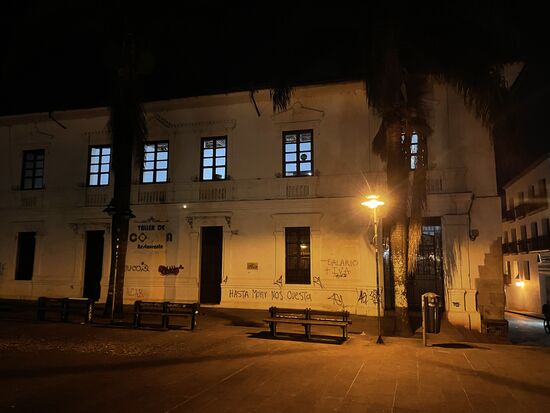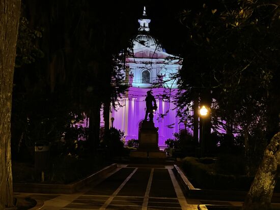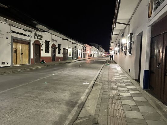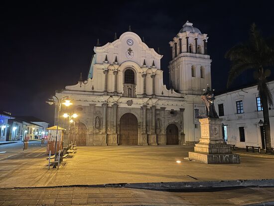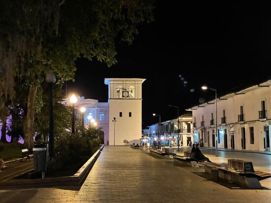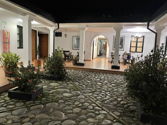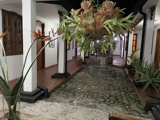 Popayan ist bekannt für seine koloniale Architektur mit weissen Häusern, habe ich gelesen. Und tatsächlich, ich habe das Gefühl in einer völlig anderen Weltl zu sein. Nach all den farbigen Dörfern ist es für die Augen eine Wohltat, diese weissen Häuserreihen zu sehen. Es sind lauter einstöckige Häuser, die meisten wahrscheinlich mit schönen Innenhöfen, wie sie auch mein Hotel hat. Vorne an der Strasse gibt es grosse Holztore, vergitterte Fenster, weisse Fassaden und alle paar Meter eine schmiedeiserne Lampe. Die Strassen sind gut beleuchtet, aber völlig leer. Keine Autos und kaum Menschen unterwegs. Dabei ist es erst acht Uhr abends.