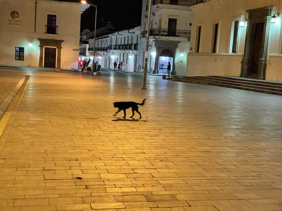Ich gehe weiter, komme an einer Kirche vorbei, und stehe bald auf dem Hauptplatz. Eine weitere Kirche, lange Fassaden, rosa Beleuchtung und fast niemand auf den Strassen. Ein einsamer Hund läuft über den Platz. Ein paar wenige kleine Beizlein sind geöffnet, das meiste ist zu, die Tore verschlossen und zeigen nicht, was sich dahinter verbergen könnte.