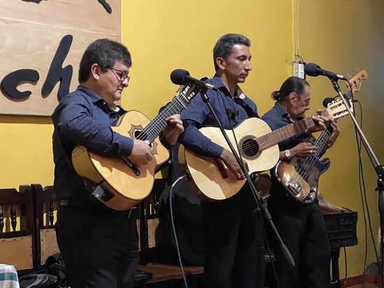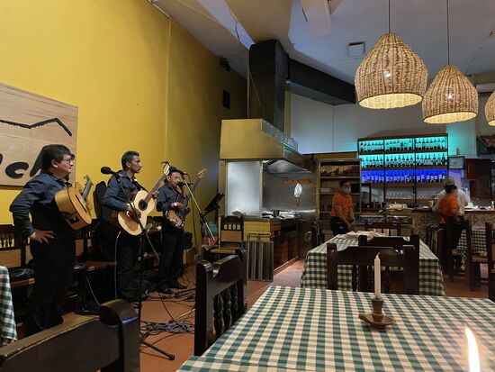 Allerdings komme ich nicht bis zur Pizzeria. Vorher dringt Musik auf die Strasse und zieht mich magisch an. Tatsächlich ist es ein grosses Restaurant, das zu einem Hotel gehört, in dem drei Männer mit Gitarre aufspielen. Sie singen so schön, dass ich einfach eintreten muss. Ich muss ihnen zuhören, muss einsinken in diese drei Stimmen, in die spanischen Schlager, von Herz und Schmerz. Von corazon y amor und von Besa me ohne Ende.