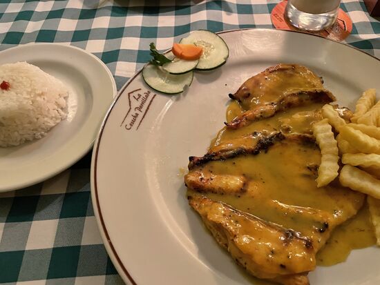 Was ich gegessen habe, hätte ich glatt vergessen, wenn ich es nicht fotografiert hätte: Ein Pouletschnitzel mit Mangososse und Reis und Pommes, dazu einen Salat. Und wieder einmal eine Limonade-Coca. Mir fällt auf, dass zum Essen sehr wenig Alkohol getrunken wird. Die meisten Leute trinken einen Fruchtsaft. Sogar die Musiker haben grosse Gläser mit einem Saft vor sich.