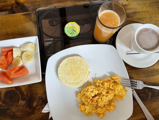 Auch hier gibt es zum Frühstück Huevos Pericos, Rührei mit Tomaten und Zwiebeln, dazu ein Arepa, einen Maisfladen. Ich esse ihn meistens, hoffe immer, dass er mir mit der Zeit vielleicht besser schmeckt, aber bisher hat das nicht geklappt. Allerdings gibt es verschiedene Qualitäten, der heutige gehört zu den besseren. Dazu frische Früchte und einen Papayasaft. Und heisse Schokolade, den Kaffee werde ich mir später irgendwo besorgen.