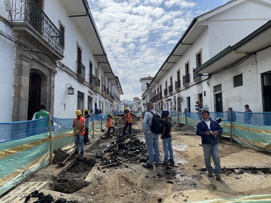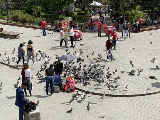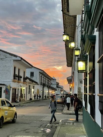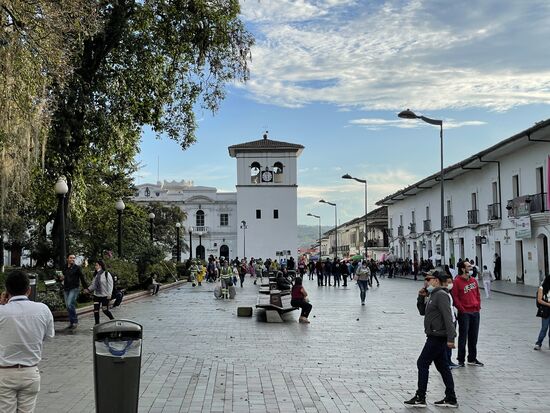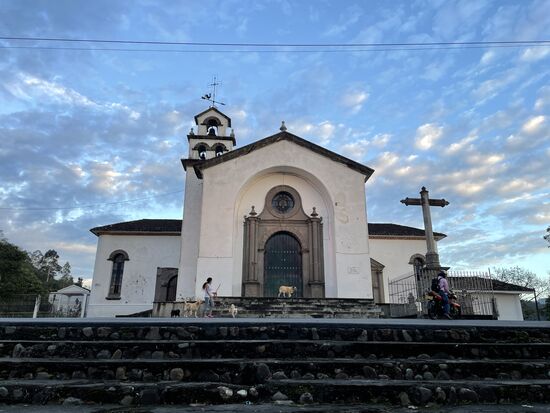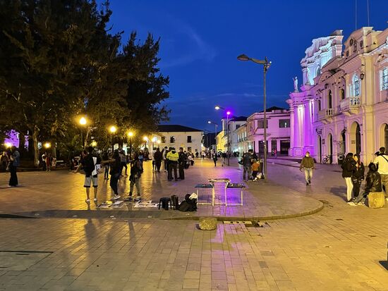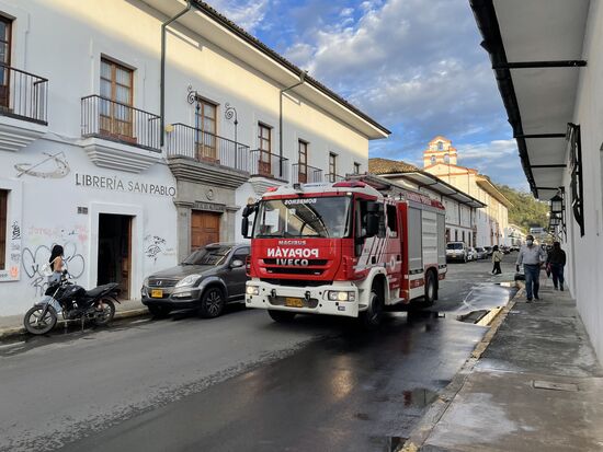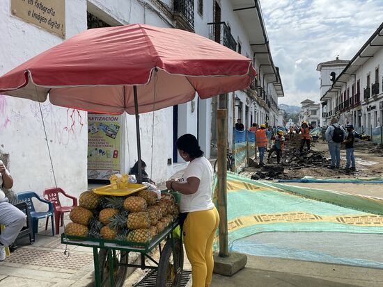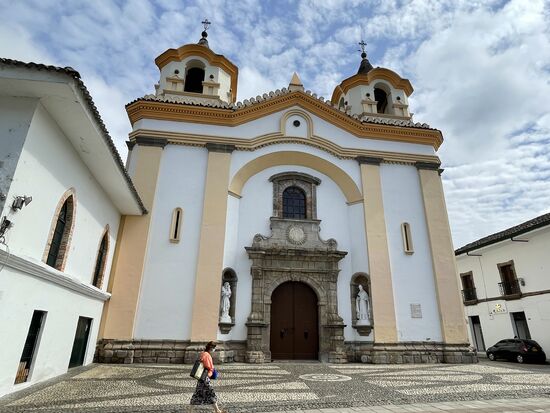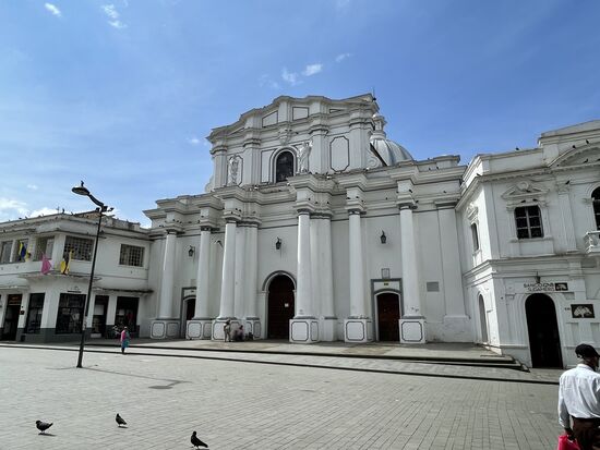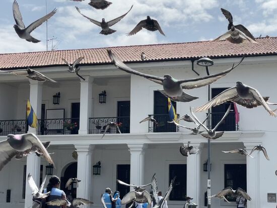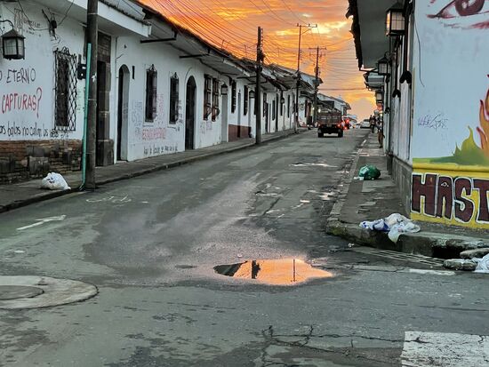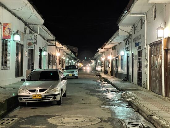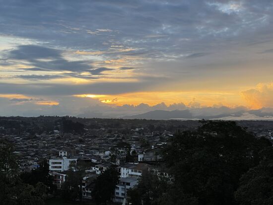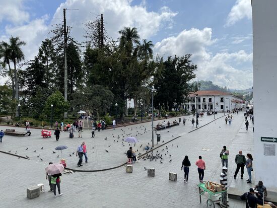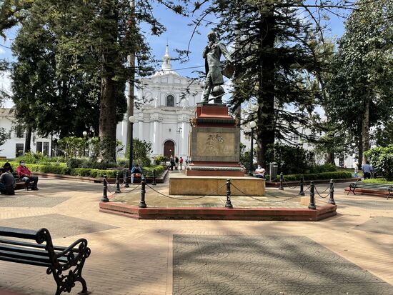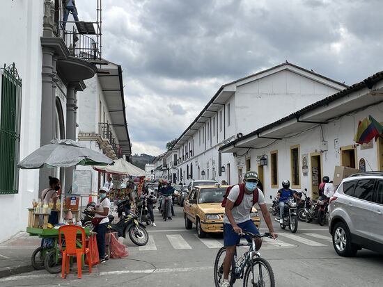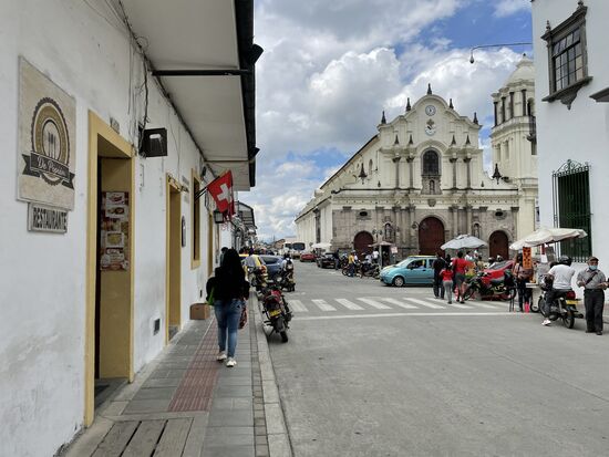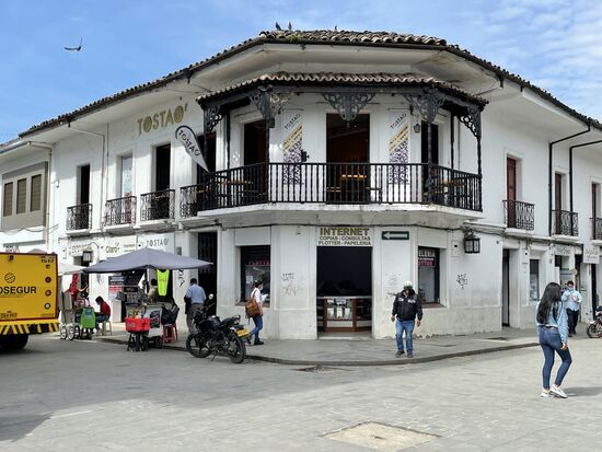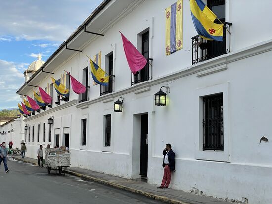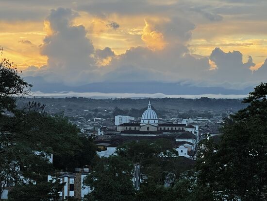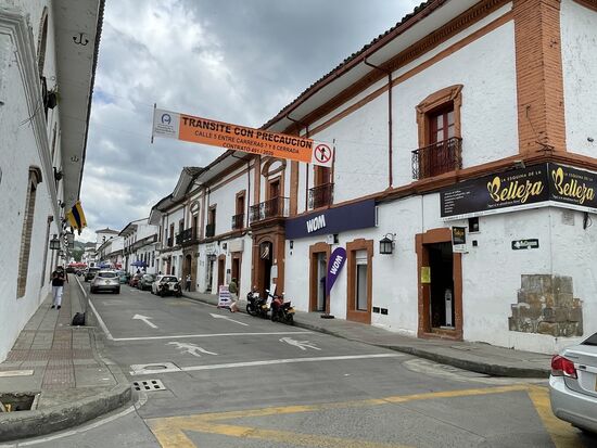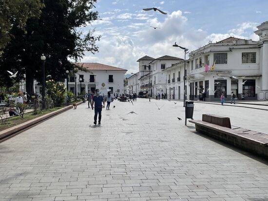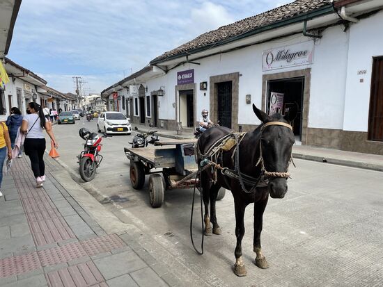 Am Strassenrand, der noch gestern völlig leer war, sind jetzt Autos parkiert und da steht sogar ein Pferdefuhrwerk. Popayan ist eine ländliche Stadt mit knapp 300'000 Einwohnern. Sie liegt nahe des Aequators und darum würde es hier oft mehrmals täglich regnen. So habe ich es gelesen. Im Moment scheint mir der Himmel blau, zwar mit Wolken überzogen, aber hell.