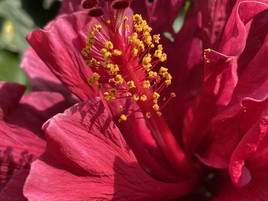 Nach einer Weile, es sind jetzt schon ziemlich viele Leute da, gehe ich hinunter in den Park. Fotografiere die schönen Blumen, die ich zwar schon oft aufgenommen habe, aber irgendwie ist jede Blume wieder neu. Eine andere Farbnuance, eine andere Beleuchtung. Bei den orangen Wandelröschen entdecke ich einen winzigen weissen Schmetterling, der von Blüte zu Blüte schwebt. Doch leider kann ich ihn nicht einfangen. Dafür aber den dicken schwarzen Brummer mit den schillernden Flügeln.