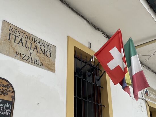 Ich habe genug gesehen, muss meine Augen und mein Hirn etwas ruhen lassen. Zum Glück habe ich meine Kamera, die mich beim Sehen unterstützt. Ich mache mich auf den Rückweg zum Hotel. Dabei komme ich wieder bei der Pizzeria vorbei. Und diesmal sehe ich es, das Schweizer Kreuz, das vor dem Lokal zusammen mit der italienischen Tricolore und der Kolumbianischen Fahne flattert. Eine Freundin hat mir letzte Nacht geschrieben, dass es hier ein italienisches Restaurant mit schweizer Führung gibt. Schon gefunden, die Stadt ist tatsächlich nicht gross.