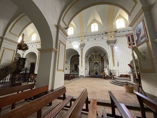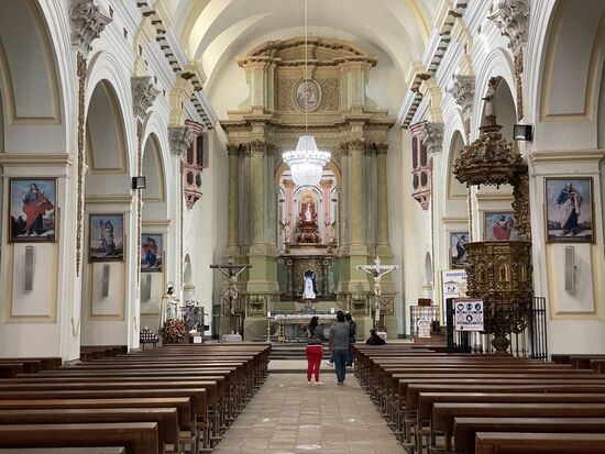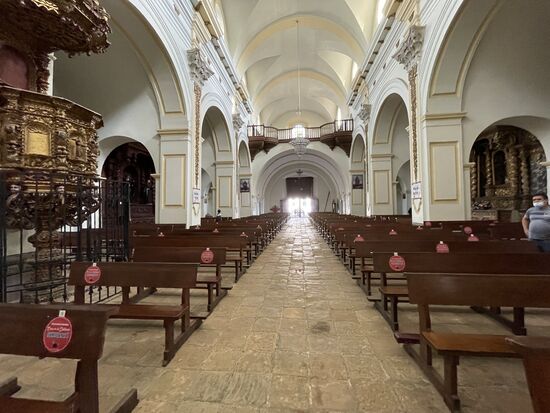 Bei der Kirche auf meinem Weg sind die grossen Torflügel offen, so dass ich eintreten und mich umsehen kann. Auch hier wie in fast allen Kirchen in denen ich war, sind viele Bänke mit Absperrband markiert. Abstand mindestens zwei Meter. Oder es gibt Markierungen, wo man sich hinsetzen darf. Ganz vorne wird gebeichtet.
