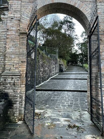 Tatsächlich, da ist eine Treppe. Hinter einem grossen Tor windet sich eine breite gezogene Treppe hinauf. Ob die wohl irgendwann das Tor schliessen? Vorsichtig erst, steige ich ein paar Stufen hinauf, es ist ein Kreuzweg, an den Seiten stehen die Stationen. Als hinter mir ein paar Jugendliche ebenfalls durch das Tor kommen, werde ich mutiger und gehe weiter hinauf, denn es zeigt sich, dass es genau das ist, was ich mir gewünscht hatte. Ein Aussichtspunkt. Oben steht eine Kirche und ich kann die ganze Stadt überblicken. Es ist zwar noch nicht ein Sonnenuntergang, wie ich ihn mir wünschen würde, aber immerhin bietet sich mir hier ein Panorama über die Stadt und die hinter den Wolken versinkende Sonne. Und als ich genauer hinsehe und den Ausschntt wechsle kommt wieder ein Vergleich auf mit Italien. Der Dom von Florenz im letzten Licht des Tages.