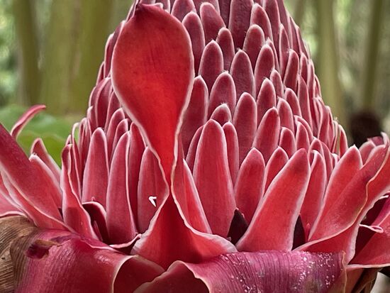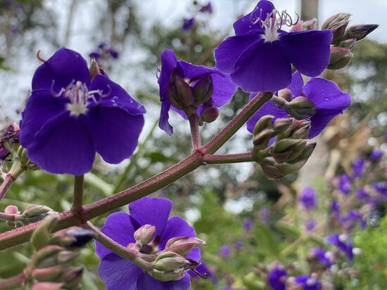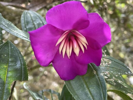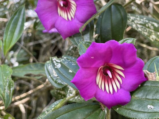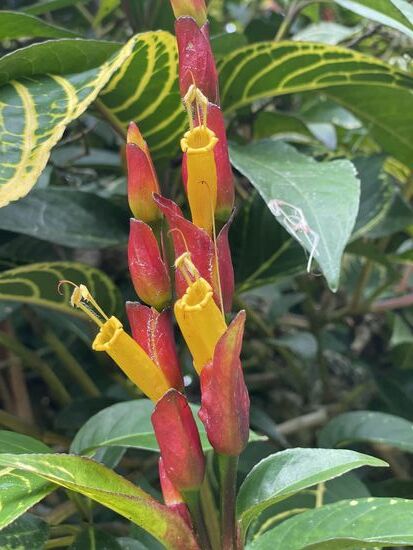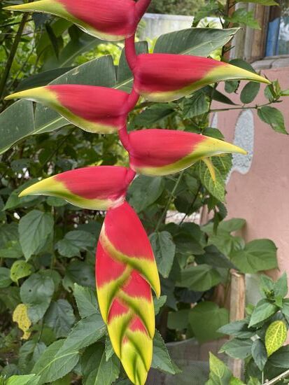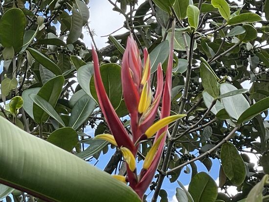 Ich trinke im Restaurant einen grossen Guanabana-Saft und fotografiere ein paar Blumen in den Büschen. Ich habe diese violetten Blüten mit den weissen Zusatzblüten im Innern noch nie gesehen. Immer wieder erstaunlich, was es alles für Formen und Farben gibt. Neben dem Café wächst ein riesiger Busch mit Hummer-Heliconias.