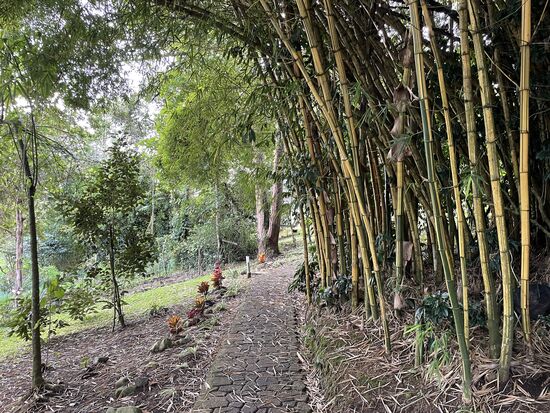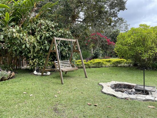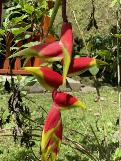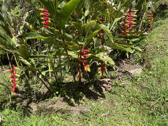 Gestern hatte ich nichts getan, hatte mich in die Hängematte gelegt und das Buch zu Ende gelesen. Und dann bin ich etwas durch den Garten gestöbert und habe Blumen fotografiert. Ich kann mich noch immer begeistern ob den wunderschönen Heliconias. Im Garten gibt es aber auch ganz spezielle Begonien, fleissige Lieschen in rot und weiss, knallrote Amaryllis und in einer Ecke habe ich ein paar Orchideen gefunden. Leider hat es im Moment keine Blüten. Dazu kommen hohe Bambushaine, Bäume mit wunderbaren blauen oder gelben Blüten und ganz viele hohe Bäume. Der ganze Garten ist angenehm schattig mit vielen bequemen Sitzgrupen. Am ersten Abend brannte irgendwo ein Feuer. Man könnte also einen gemütlichen Abend draussen geniessen. Wenn es dann nicht gerade regnet. Im Moment ist Regenzeit, da muss man immer wieder mit einem Regenguss rechnen.
