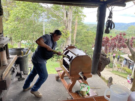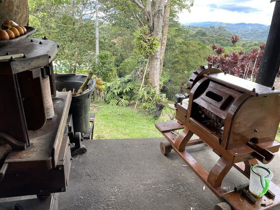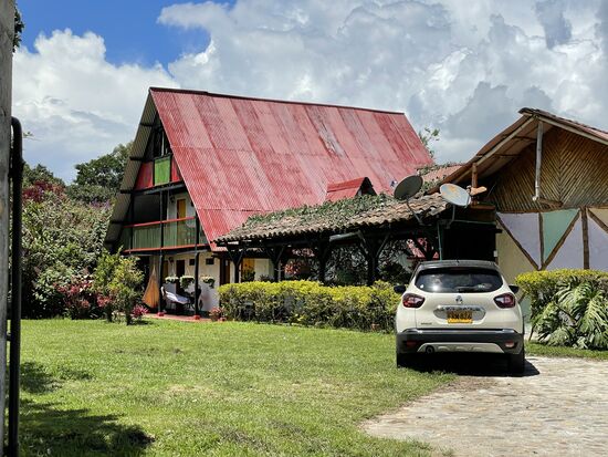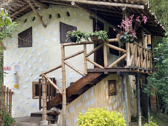 Überhaupt bin ich begeistert von der ganzen Finca. Von all den vielen kleinen Details in der Dekoration und von den Ideen mit der Nachhaltigkeit. Das Essen kommt vorwiegend aus der nächsten Umgebung. Es gibt zwei Kühe und ein paar Hühner, die einerseits Eier, aber auch Fleisch liefern. Ausserdem gibt es einen Garten in dem Gemüse wie Zwiebeln, Tomaten und Karotten gezogen wird. Das Brot wird jeden Morgen frisch gebacken. Ich bin völlig fasziniert, und habe es dem René auch gesagt, als ich ihn gestern kurz getroffen habe. René Suter, ein Schweizer. Ihm gehört dieser wunderbare Ort. Innert den letzten 25 Jahren hat er hier ein Paradies geschaffen. Ein zentrales Gebäude, das sich nicht abhebt, sondern in die Gegend einfügt und trotzdem gross genug ist für ein paar schön aufgedeckte Tische und eine kleine Sitzecke. Dazu verschiedene Bungalows und seit wenigen Jahren zwei Rund-Zelte, um nicht noch mehr Bungalows zu bauen. Alles wunderbar bequem eingerichtet und gebaut mit dem Rohstoff, von dem es hier zur Genüge hat: Bambos. Und überall gibt es frische Blumen auf den Tischen. An den Bungalows hängen Blumentöpfe mit Begonien.