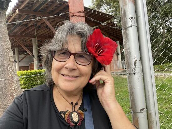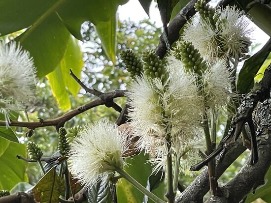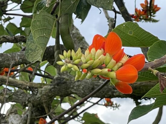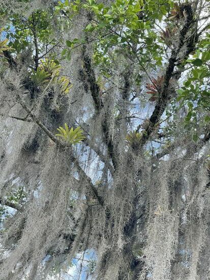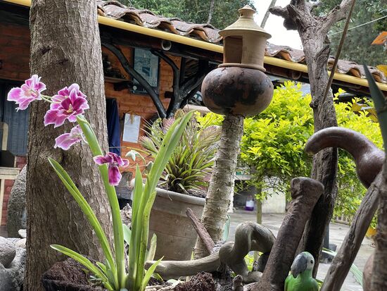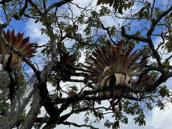 Ich sehe mir die paar Statuen an, es sollen die höchsten der Gegend sein und bewundere den Baum mit den vielen Baumbärten. Später habe ich erfahren, dass das Tillandsian sind, die man auch in der Schweiz in Blumengeschäften kaufen kann. Hier schwingen sie wunderbar im Wind und haben den ganzen Baum eingenommen. Dazwischen gibt es ein paar riesige Bromelien. Die roten Blüten, am anderen Baum habe ich noch nie gesehen.