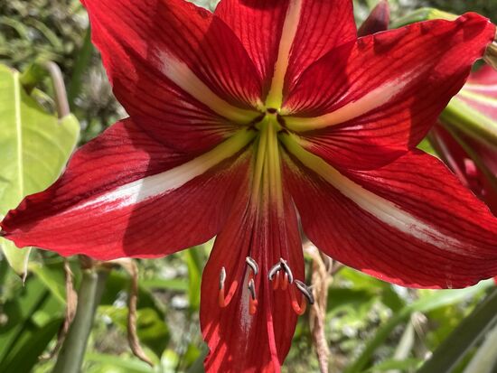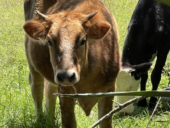 Schon die erste Anweisung halte ich nicht ein, ich gehe nicht ganz hinunter zur Hauptstrasse, zweige schon vorher beim öffentlichen Bassin nach rechts ab und da geht es bereits zum ersten Mal steil hinauf. Was man an Höhe hat, das hat man, das muss ich später nicht mehr machen, denke ich und steige hinauf. Steil ist es, und ich muss immer mal wieder stehen bleiben um zu Atem zu kommen. Respektive, um das Pferde zu fotografieren, den Rindern zuzusehen, die mich neugierig über den Zaun beobachten und ein paar Blumen zu fotografieren. Rot-weisse Amaryllis blühen in vielen Gärten. Überhaupt gibt es hier ein paar wunderschöne Häuser. Villen, die zum Teil Gästehäuser und Hotels sind. Das gibt genug zu sehen und ganz allmählich erreiche ich die Höhe.