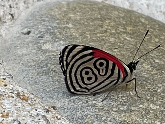 Also doch. Ich laufe weiter. Jetzt wo ich die Höhe habe, geht es sehr einfach. Und dann komme ich zur Abzweigung und verstehe, warum der Mann glaubte, dass ich falsch bin. Es ist nur ein Fussweg, der schräg abfällt und mich direkt zum Parkeingang bringt. Hier empfangen mich ein paar Schmetterlinge, als ich aus dem Tor trete, das am Ende des Fussweges steht. Sie haben mich schon den ganzen Weg gelockt, aber nie konnte ich sie fotografieren, immer flogen sie weiter. HIer flattern gleich mehrere winzige Falter. Mit blauen Innenflügeln und rot-weissen Aussenfarben. Und hier kann ich tatsächlich einen fotografieren. Danke fürs motivieren, lieber Schmetterling.