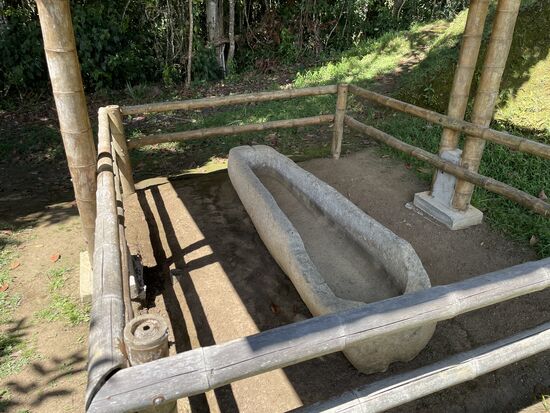 Auch der nächste Komplex sind wieder Gräber. Schöne Figuren mit grossen runden Augen, geschützt unter hohen Bambusdächern. Auch einen Sitzplatz gibt es, von der Sonne geschützt mit Dächern aus Bambus und bequemen Bänken. Alles aus Bambus, das ist hier das bevorzugte Baumaterial.