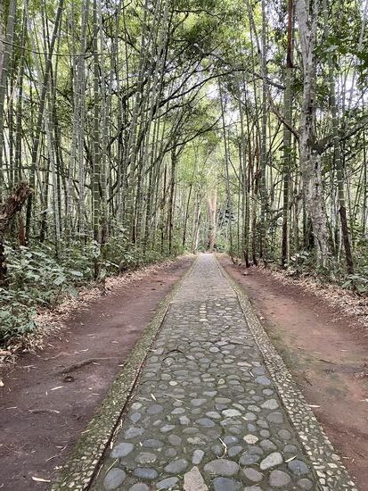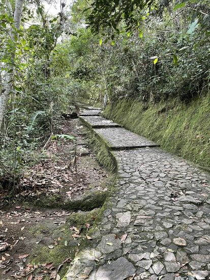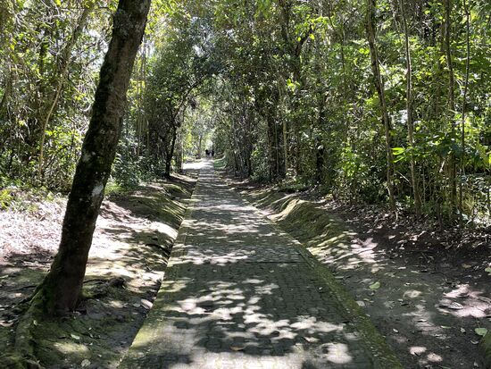 Es gibt steinerne Sarkofage und breite Figuren, die mehrheitlich Menschen darstellen. Eine erinnert mich an eine Eule. Bestimmt ein Symbol für Weisheit. Ich reime mir meine Erklärungen zusammen und gehe weiter, trete wieder in den Wald, als ich weiter vorne eine kleine Gruppe entdecke. Sie sind stehen geblieben und zeigen ganz aufgeregt zum Wald, oder zum Wegrand. Und dass ich mich beeilen soll. Und dann sehe ich die Aufregung. Eine lange schwarz-rote Schlange windet sich am Wegrand. Schleicht durchs Laub und kommt zur mossbewachsenen Böschung. Eine Coral, meint der Guia, der mit der Gruppe unterwegs ist. Sie sei giftig, wenn man sie herausfordert, fügt er noch bei, aber diese sei sehr entspannt unterwegs.
