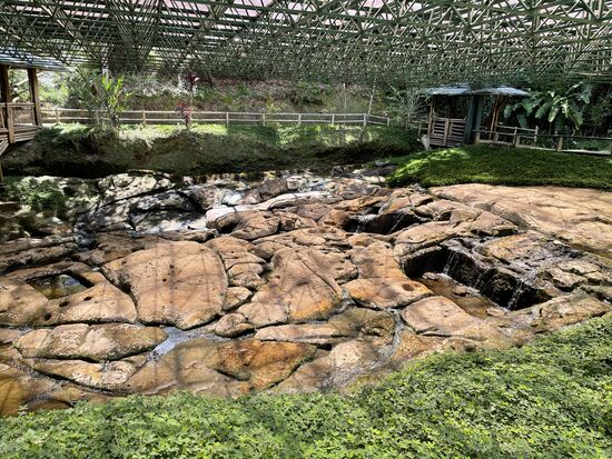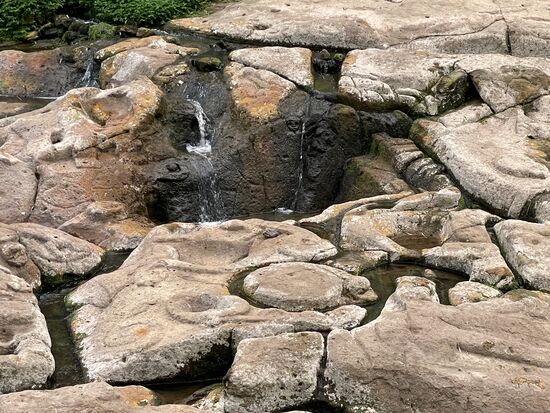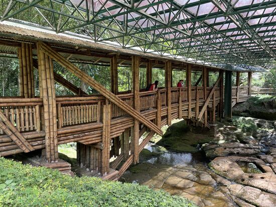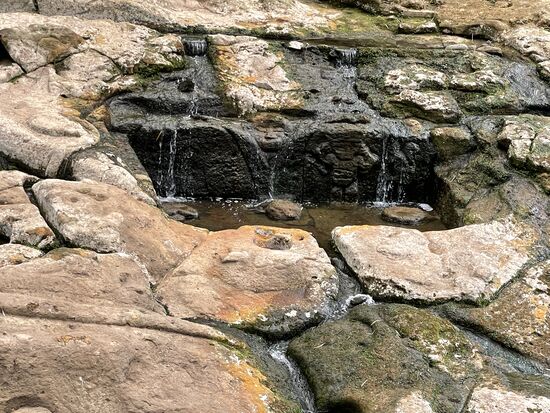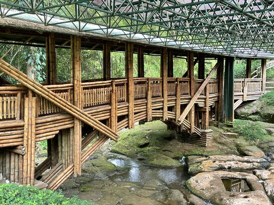 Die Quebrada ist ein breiter Wasserlauf über flache Steine, die zum Teil bearbeitet sind. Tiefe Pools wurden ausgeschnitten, Zeichen und Löcher auf die Steinplatten gearbeitet. Darüber führt eine wunderschöne Brücke. Ganz aus Bambus gebaut. Das ganze wird geschützt von einer leichten Stahlkonstruktion. Ich bleibe lange auf der Brücke stehen, schaue hinunter ins Wasser, versuche zu ergründen, was für eine Bedeutung der Platz wohl gehabt haben mag. Wasser ist überall heilig und Ursprung des Lebens. Bestimmt wurden hier Zeremonien abgehalten. Vielleicht etwas wie Taufriten mit den Pools. Jetzt wäre es schön, einen Guide zu haben, der mir ein paar Dinge erklärt, die man inzwischen von der alten Kultur erforscht hat.