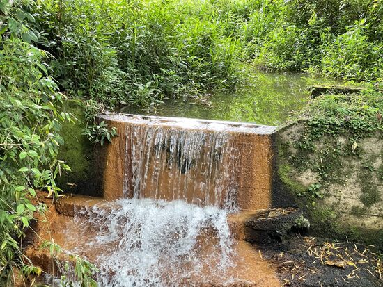 Also steige ich ab. Der Weg ist angenehm im Schatten der Bäume und schon bald steht da wieder eine Statue. Ein Frosch, das ist eindeutig zu erkennen. Wahrscheinlich als Zeichen für das Wasser, das ich weiter unten rauschen höre.