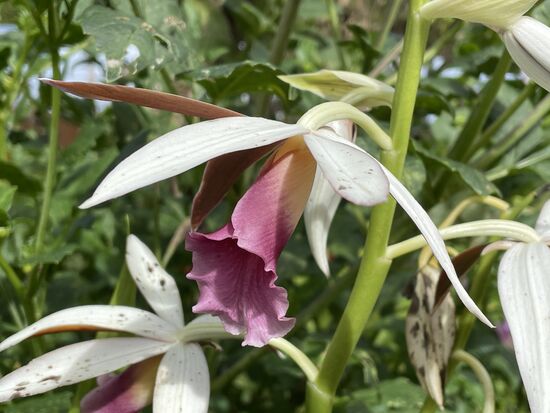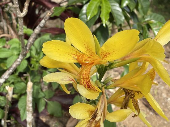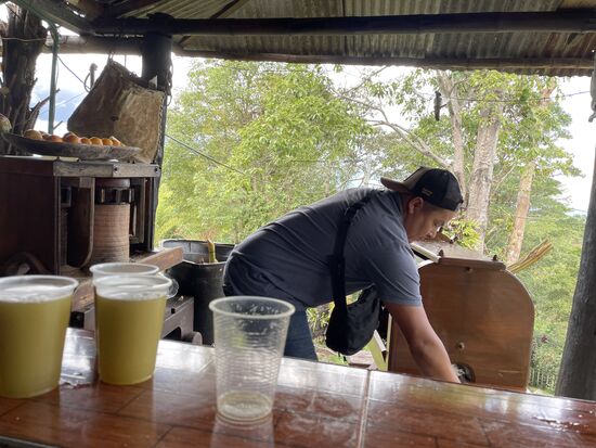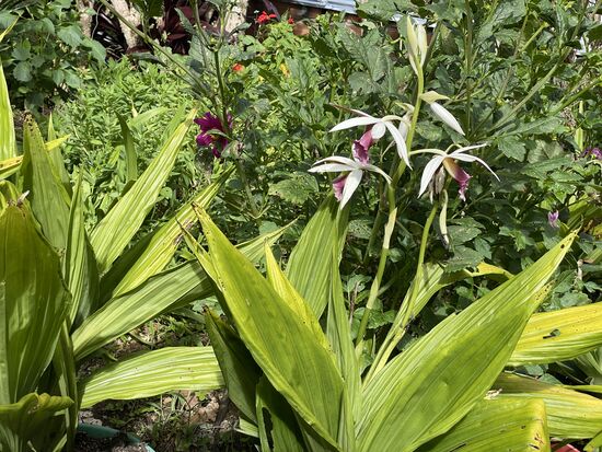 Auf dem Abstieg kehre ich in einem der beiden Restaurants ein. Ich habe dort vorher eine Zuckerrohr-Presse gesehen und tatsächlich, der Saft wird frisch hergestellt. Dazu eine halbe Zitrone, die dem Getränk die Süsse etwas nimmt. Auch hier gibt es wieder ganz viele Blumen zu fotografieren. Vor allem finde ich hier ein paar Orchideen in den Töpfen.