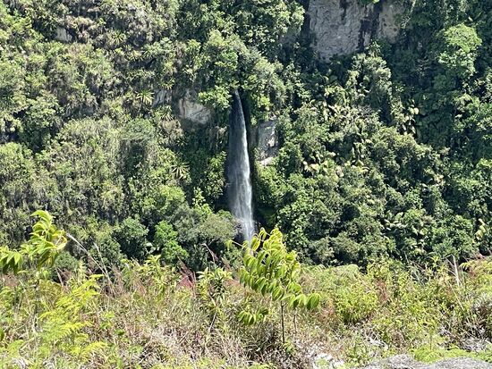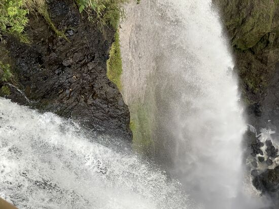 Es ist ein eindrücklicher Wasserfall, der im freien Fall über 200 m in die Tiefe stürzt. Hinunter in eine unzugängliche Schlucht. Es gibt einen kleinen Aussichtspunkt, von dem man den besten Blick auf die Kaskade hat. Das braucht allerdings etwas Mut, denn es ist eine Eisenkonstruktion, die einen knappen Meter über den Rand der Schlucht gebaut ist. Nach einigem Zögern traut sich auch Jefferson hinaus und schiesst ein paar Fotos.