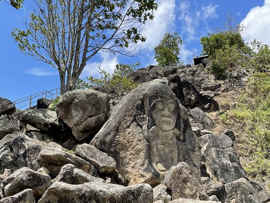 Frisch gestärkt und bereichert nach dieser sympathischen Begegnung fahren wir weiter. Noch einmal gibt es Statuen zu besichtigen. Doch diesmal kann man bis zu der Ausgrabungsstätte fahren. Allerdings gäbe es einen Parkplatz und danach geht es eine Wiese hoch. Doch Jefferson meint zu der Frau, die den kleinen Obolus des Eintritts kassiert, seine Passagierin sei müde vom Laufen. So kann man das natürlich auch sehen.