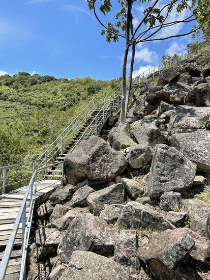 Ein paar Häuser, ein Verkaufs-Stand an dem man etwas zum Trinken kaufen könnte und ein paar Steinskulpturen. Replicas, weiss Jefferson. Aber es führt ein Weg hinunter in die Schlucht. Ein Weg und dann eine lange gut ausgebaute Treppe. Es gibt hier einen sehr schönen Aussichtspunkt und in den grossen Felsenbrocken eine Figur, die mit erhobenen Händen in die Gegend blickt. Ob es eine Abwehrhaltung ist? Nein, hier kennt sich Jefferson ein wenig aus, es scheint ein Priester zu sein. Vielleicht betet er die Sonne an, die Natur, das Wasser tief unten.