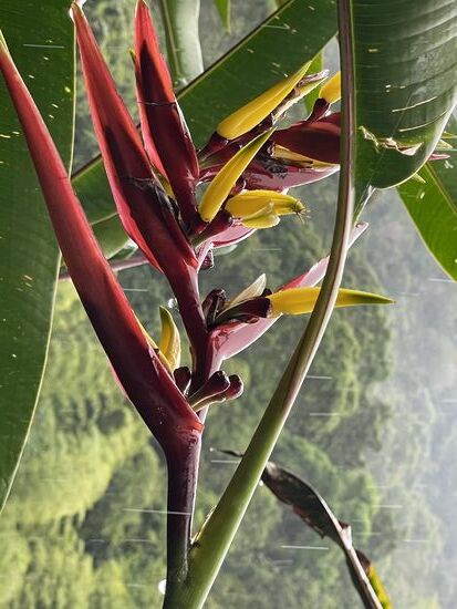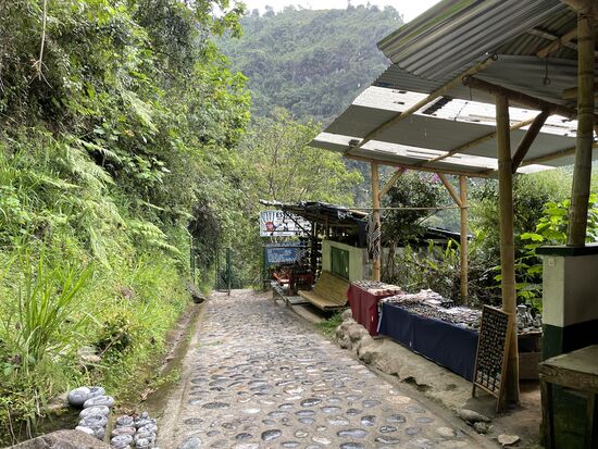 Wir steigen derweil hinunter zur Stromschnelle. Hier macht der Fluss einen rechten Winkel und das Wasser kämpft sich zwischen Felsen hindurch. Manchmal, wenn es viel regnet, steige der Pegel um mindestens einen Meter, dann sei hier die Hölle los, erzählt Jefferson und zeigt mir ein Video. Wir steigen wieder hinauf, während es jetzt ganz fein anfängt zu regnen. Oben wieder angekommen, stellen wir uns noch einen Moment unter das Dach des kleinen Ladens und ich sehe einer Frau zu, die am Häkeln ist. Was das wird, will ich wissen. Sie macht Hüte und das Garn, das sie benutzt, hat sie selber gesponnen. Aus Bananenfasern. Was für eine Arbeit. Zuerst müssen die Fasern von den Bananenstecken gelöst werden, dann getrocknet und versponnen. Das Häkeln ist dann noch der kleineste Aufwand. Ich kaufe einen Hut, den hätte ich besser schon vorher gekauft, dann wäre ich jetzt nicht so nass geworden.