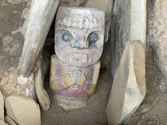 Die Figuren hier sind speziell, weil sie noch einen Rest der Originalfarben aufweisen. Es scheinen Grabhüter zu sein, jedenfalls stehen sie am Eingang zu Tunnels, die mit schweren Steinplatten bedeckt sind. Da beide Figuren kleine Kinder in der Hand halten, könnte es sich auch um Opfergaben handeln. Bei der rechten Figur ist nur der Kopf eines Kindes ersichtlich, während die andere das Kind mit beiden Händen festhält.