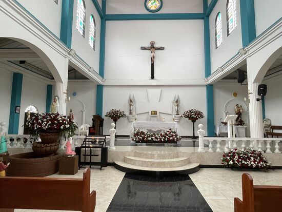 Ich besuche noch die grosse Kirche und staune über den reichen Blumenschmuck. Rosen und Margeriten zieren den Altarraum. Ein lautes Hupen draussen lockt mich wieder auf die Strasse. Da ist soeben ein Bus vorgefahren. Er wurde wohl früher für Personentrasporte benutzt, aber jetzt scheint er als Lastwaren gebraucht zu werden. Jedenfalls ist er voll beladen mit Backsteinen. Einzig hinter dem Fahrer sind noch ein paar Sitze und gerade klettert eine Frau aus dem hohen Bus, wo längst keine Stufen mehr angebracht sind.