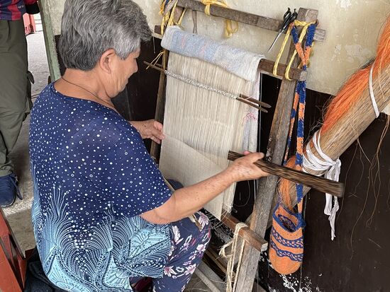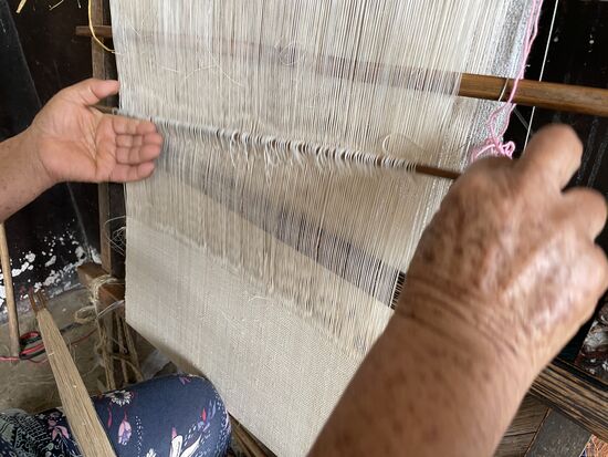 Vom Chauffeur ist keine Spur mehr zu sehen, aber der Motor läuft. Ich finde Jefferson im Gespräch mit einer Frau und sie lädt mich ein, ihr beim Weben zuzusehen. Auch sie arbeitet mit Bananenfasern, die sie zu einem sehr feinen Garn versponnen hat. Damit webt sie ein Tischset. Schon zwei Tage ist sie daran und es wird noch ein paar Tage dauern, bis es fertig wird. Daneben ist der junge Chauffeur beim Mittagessen. „Willst du eine Runde mit mir fahren?“ fragt er. Und ob ich will.