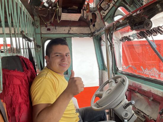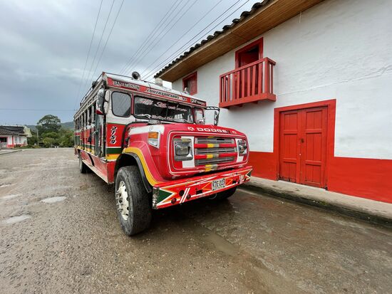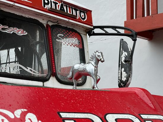 Später darf ich vorne neben dem Chauffeur einsteigen. Mit Blick auf das silberne Pferd, das auf der Motorhaube steht. Knatternd fahren wir los, einmal um den Hauptpiatz.. Woher ich komme, will der Chauffeur wissen. Er hätte früher, vor der Pandemie auch für den Tourismus gearbeitet, jetzt sei halt alles ganz anders. Er wünscht mir noch eine gute Reise und viele tolle Erlebnisse in Kolumbien, dann muss er mit seinern geladenen Bausteinen an ihren Bestimmungsort.