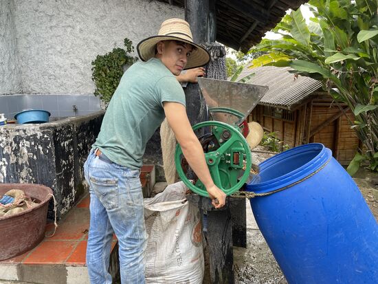 Tatsächlich gibt es auch eine beeindruckende Orchideensammlung, für die seine Frau zuständig sei. Ein junger Mann ist dabei, Kaffeebohnen zu schälen. Es scheint ziemlich anstrengend zu sein, die Kurbel an der Maschine zu drehen, die die Fruchtschale von den beiden Bohnen trennt. Ich stibitze ein paar reife Früchte, vielleicht starte ich mit einer eigenen Kaffeeplantage.
