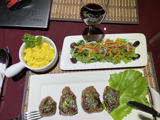 Später im Hotel habe ich mir zur Feier des Tages das Filet Cafe de Paris bestellt, und eine halbe Flasche vom Feinsten.