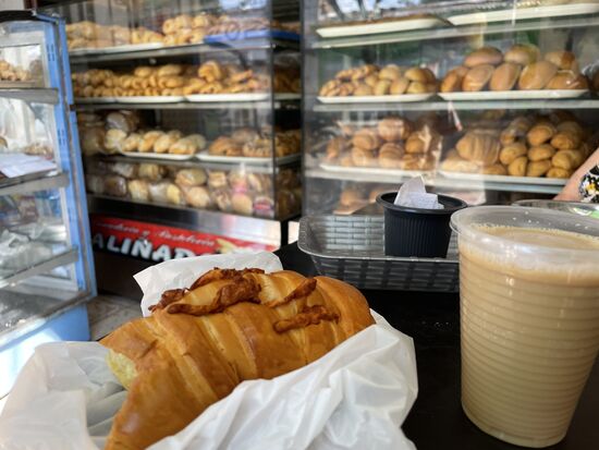 Sonntagmorgen, es ist alles geschlossen. Nur die kleine Bäckerei um die Ecke hat geöffnet und es gibt ein kleines Frühstück. Unglaublich, was die alles für verschiedene Backwaren anbieten. Süsses und salziges, mit Früchtefüllung oder mit Käse. Aus Maismehl oder aus Weizenmel.