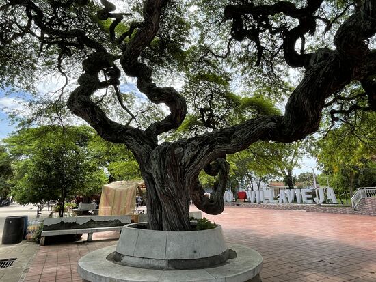 Zuerst sehen wir uns den Hauptplatz von Villavieja an. Hier fallen vor allem die alten Bäume auf und ein riesiges Magaterium, ein Riesenfaultier aus der Zeit vor der letzten Eiszeit. Solche Tiere werden wohl damals zusammen mit Mammuts die Gegend bevölkert haben. Man darf sich dabei gern in die Zeit von Ice Age mit ihren riesigen Tieren zurückversetzen. MIt dem heutigen Faultier hat dieses Riesending übrigens nicht mehr viel gemein.