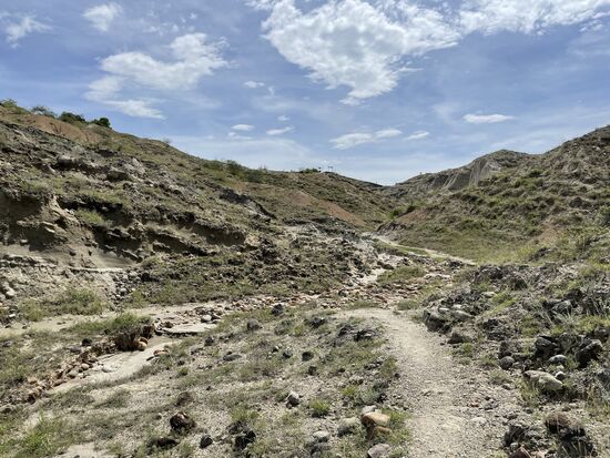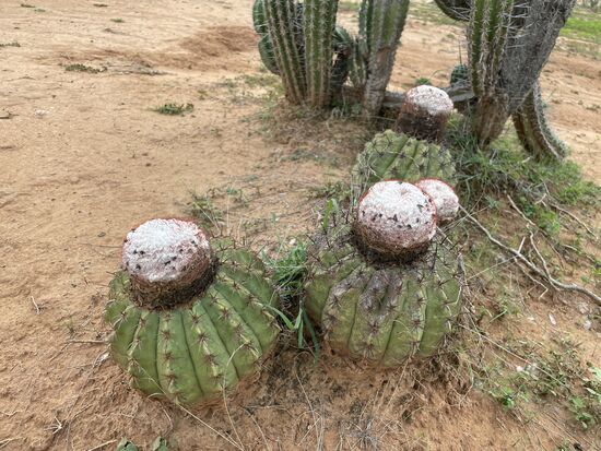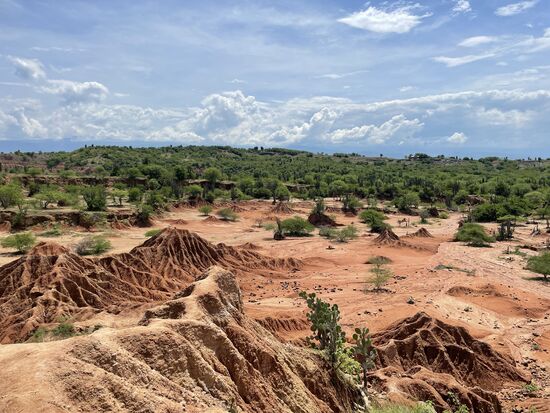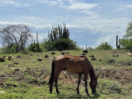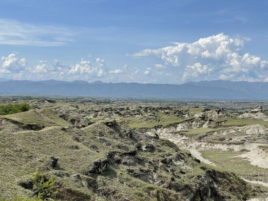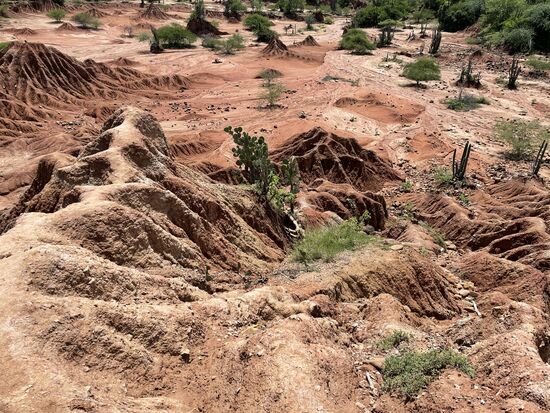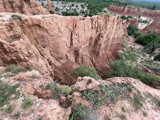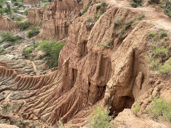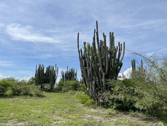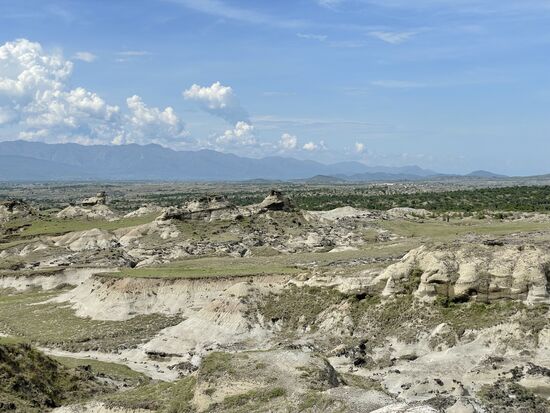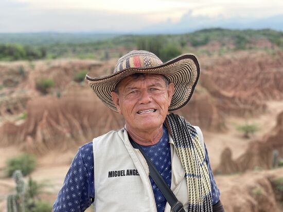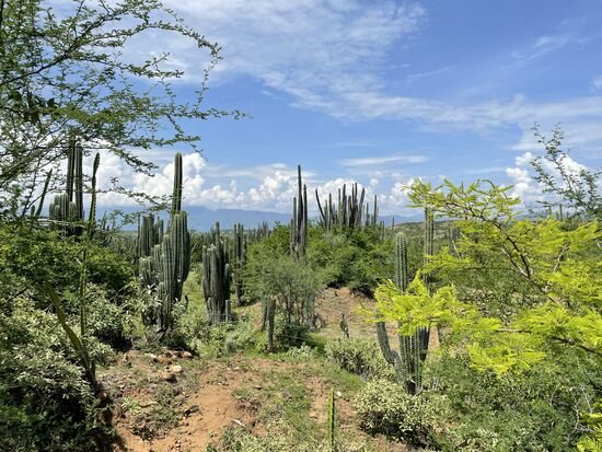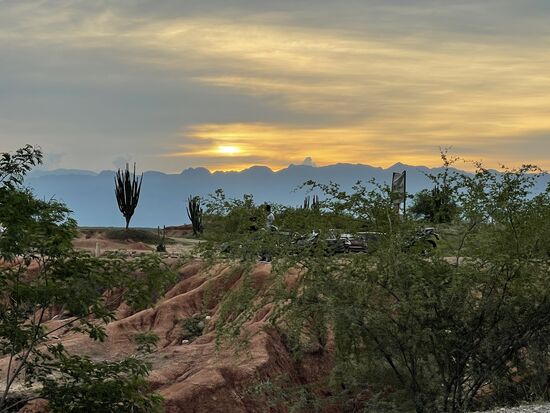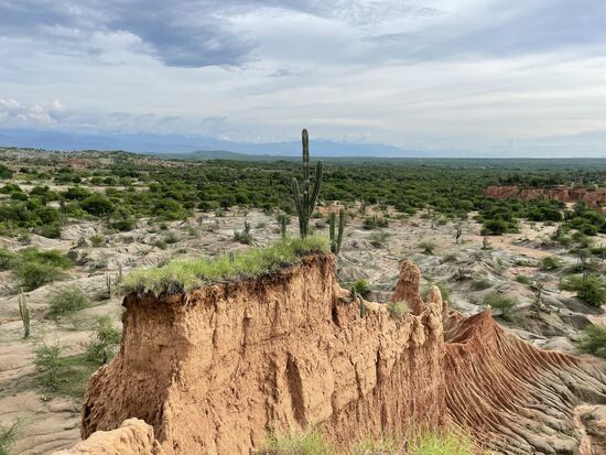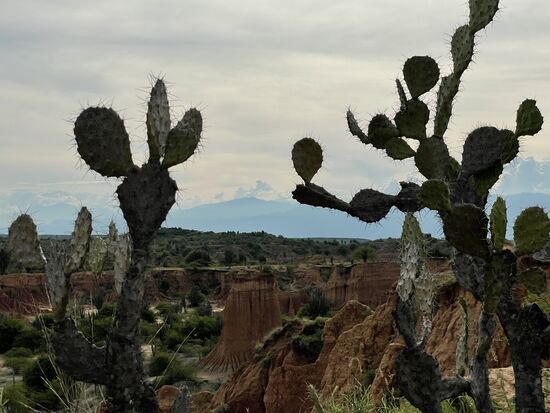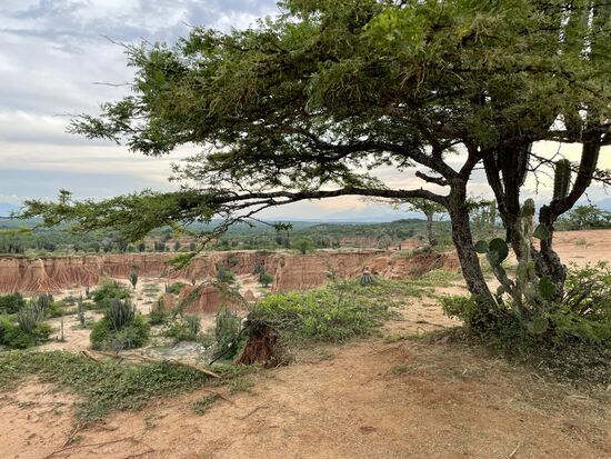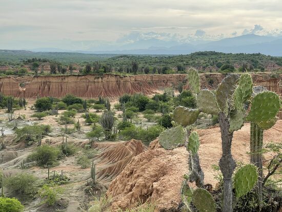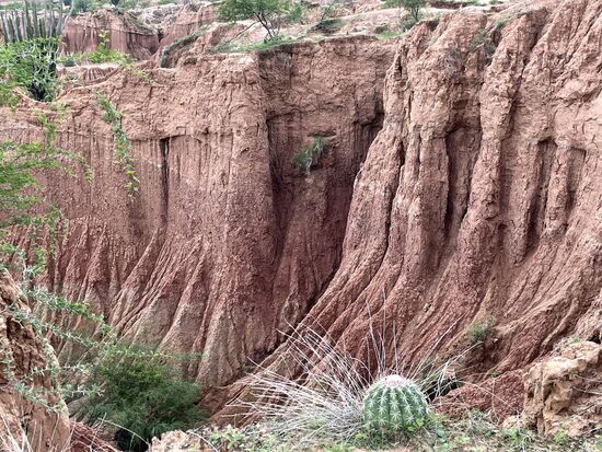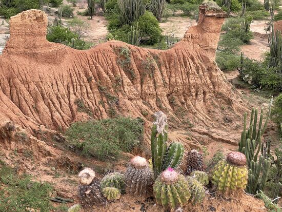 Inzwischen haben wir die Gruppe erreicht. Es sind junge Leute aus Deutschland und Holland und Isabelle übernimmt sie in Englisch, während ich mit Miguel Angel starte. Er weiss genau Bescheid über die Pflanzen, die Beschaffenheit des Bodens und die Geschichte der Tatacoa-Wüste. Zeigt mir die grossen runden Kaktusse mit ihren winzigen rosa Blüten, aus denen sich kleine Früchte entwickeln, die man essen kann. Sie sehen ein wenig aus wie rote Knoblauchzehen, sind aber innen süss und saftig.