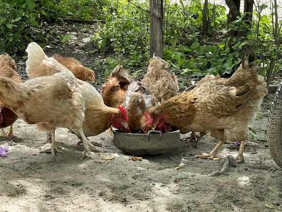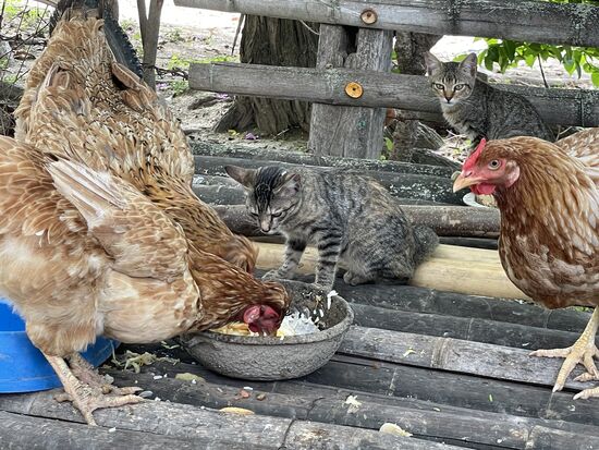 Um die Resten der Mahlzeit kümmern sich später die Hühner, zusammen mit eine paar Katzen.