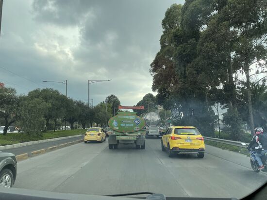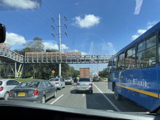 Die Fahrt soll eine gute Stunde dauern, doch wir sind kaum losgefahren, stecken wir schon in einem Stau, der die Ausfahrt in den Norden Bogotas blockiert.
