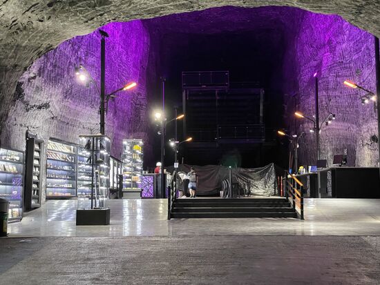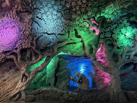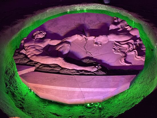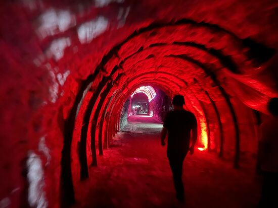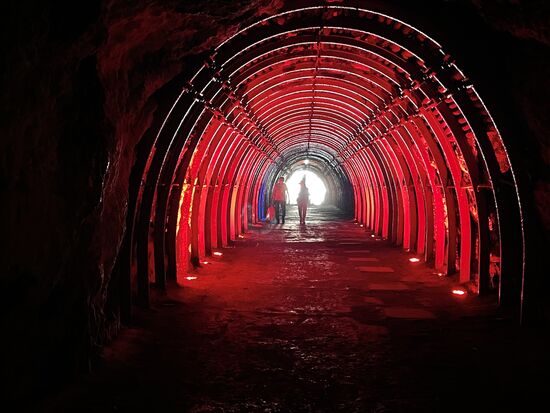 Doch richtig interessant ist erst der Blick hinter das Kreuz. Es sind riesige Schächte, hohe Kammern, die sich dahinter aufmachen und diie bis in die Tiefe mit geheimnisvollem Licht ausgeleuchtet werden.