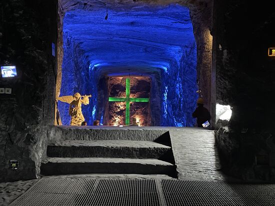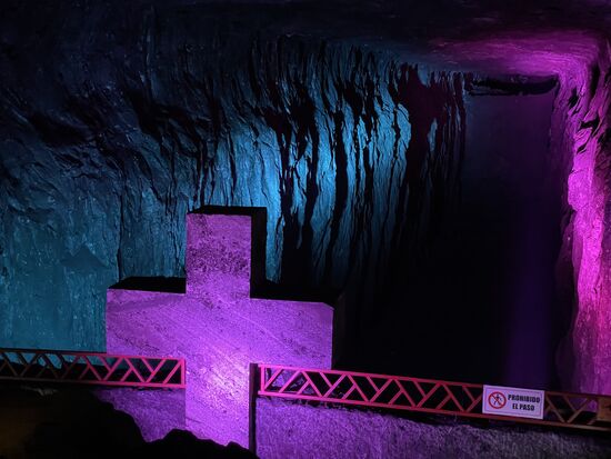 Ein Gang mit wechselndem Farbenspiel empfängt mich, ein Stollen, der tief ins Innere des Berges führt. Es geht leicht abwärts. Der Gang ist bestens ausgeleuchtet, also gar nichts von schlechter Beleuchtung. Überall gibt es in bodennähe Lampen, die den Boden beleuchten. Dieser ist alles andere als uneben. Wenn ich da an die Trottoirs in Bogota denke, dann ist das komplett gerader Boden. Ohne jegliche Löcher oder Stufen. Er neigt sich leicht, es geht in die Tiefe. Nach dem langen Einstiegsschacht geht es um eine Ecke und hier fängt der Kreuzweg an. Es sind keine Szenen, es ist immer nur das Kreuz, das ins Salz geschlagen wurde und immer wieder in anderen Farben erstrahlt.