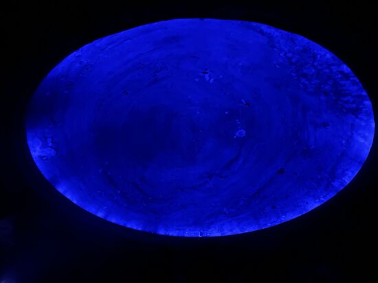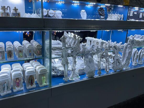 Nach der letzten Station des Kreuzweges komme ich zur Kuppel. Eine runde Kuppel, in die Decke der Kammer geschlagen und blau ausgeleuchtet. Dieser Ort soll die Verbindung zu Gott symbolisieren. Der dunkle Boden mit dem hell erleuchteten Weltall, mit dem Himmel. Auch wieder ein sehr eindrücklicher Ort, an dem ich einen Moment verweile, bevor ich die paar Stufen hinauf mache zum Balkon. Hier kann man hinunter ins Hauptschiff sehen. Im Moment ist dort eine Veranstaltung im Gang.