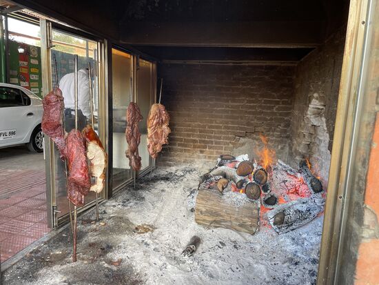 Beim Eingang gibt es eine grosse Feuerstelle, wo ganze Fleischstücke am Spiess gebraten werden. Wir bekommen alle ein kleines Häppchen, um uns gluschtig zu machen und bis wir an Tisch sitzen, hat Carlos bereits organisiert, dass all unsere Flaggen auf dem Tisch aufgestellt sind. So läuft das in einer richtigen Touristenhochburg.
