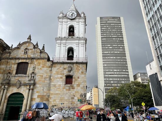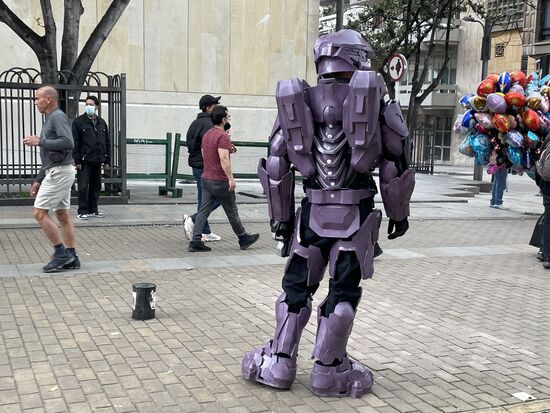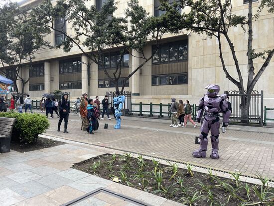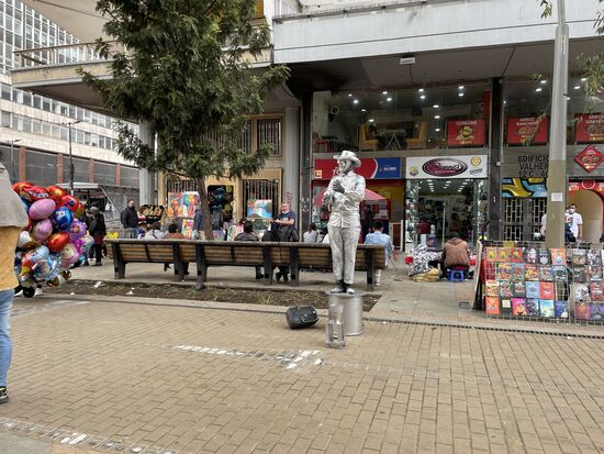 Darum ziehe ich am Samstag erst gegen Mittag los. Noch einmal zum Plaza de Bolivar. Heute sind tatsächlich noch mehr Leute unterwegs. Es gibt Gaukler und diese Sockelsteher, die unbeweglich stehen bleiben, bis man ihnen eine Münze, oder im Fall von Kolumbien eher eine Note in den Hut legt. Denn Münzen haben definitiv zu wenig Wert. Die kleinste Note ist die 2'000 Pesos-Note und die entspricht ca. 50 Rappen.