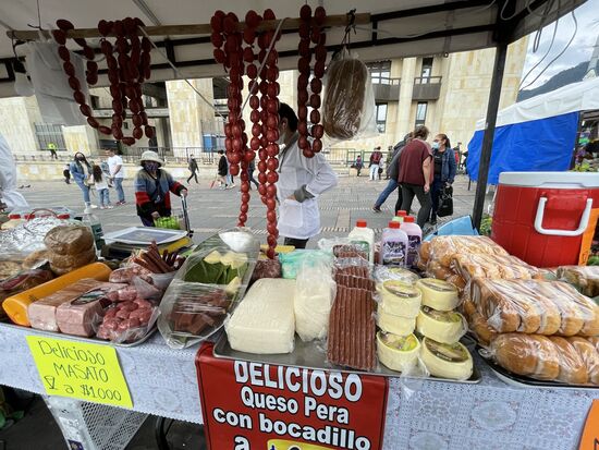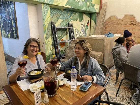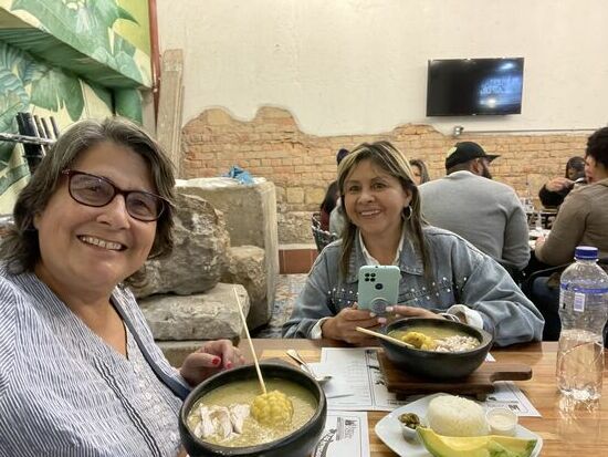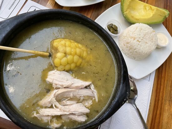 Und dann lädt mich Nubia zum Nachtessen ein. In ein typisches Lokal mit einheimischen Spezialitäten. Wir bestellen Ajiaco Santaferena, eine Kartoffelsuppe mit Hühnerfleisch. Darin ist ein Stück Maiskolben mit grossen Körnern. Dazu gibt es weissen Reis, den man nach und nach in die Suppe löffelt. Ein paar Kapern, etwas Creme fraiche und ein grosses Stück reife Avocado runden das Gericht ab.